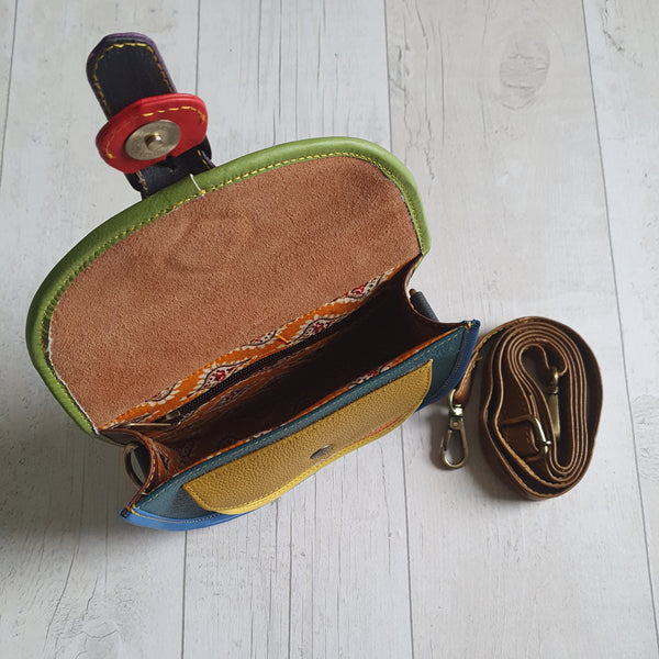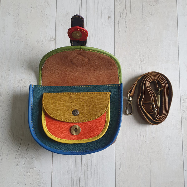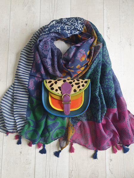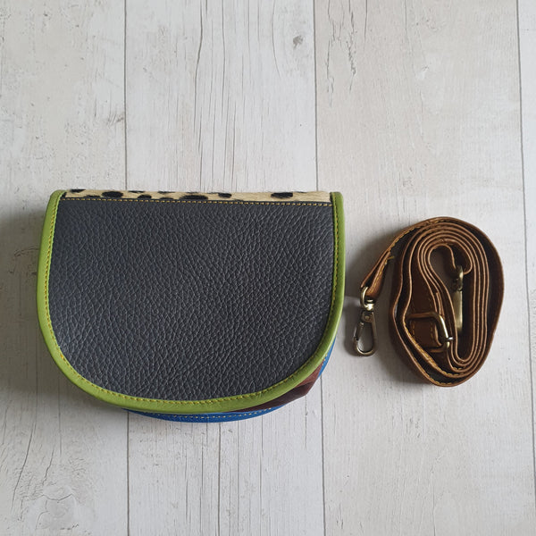 The soft leather dark teal spot olivia bag is hand crafted using eye catching pieces of leather offcuts destined for landfill. So your bag is a one off, completely unique to you and sustainable too.